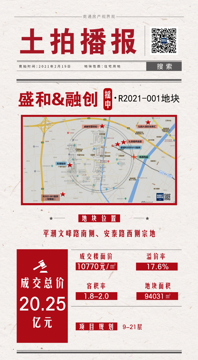 2月19日,平潮高鐵新城“雙限”R2021-001地塊搖號結果正式出爐,盛和房產攜手上海融創以總價20.25億元(成交樓面價10770元/㎡)摘得R2021-001地塊。